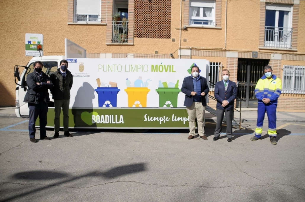 Acompañado por el Presidente y Consejero Delegado de Grupo Raga, Antonio Alfonso, y junto a David Mesa, Quinto Teniente de Alcalde y Concejal de Medio Ambiente, y Juan Carlos Martín, Coordinador de Medio Ambiente, el Alcalde de Boadilla del Monte, Javier Úbeda, visitó el pasado martes, el punto limpio móvil de la localidad.
