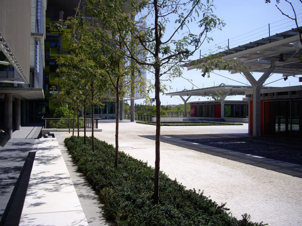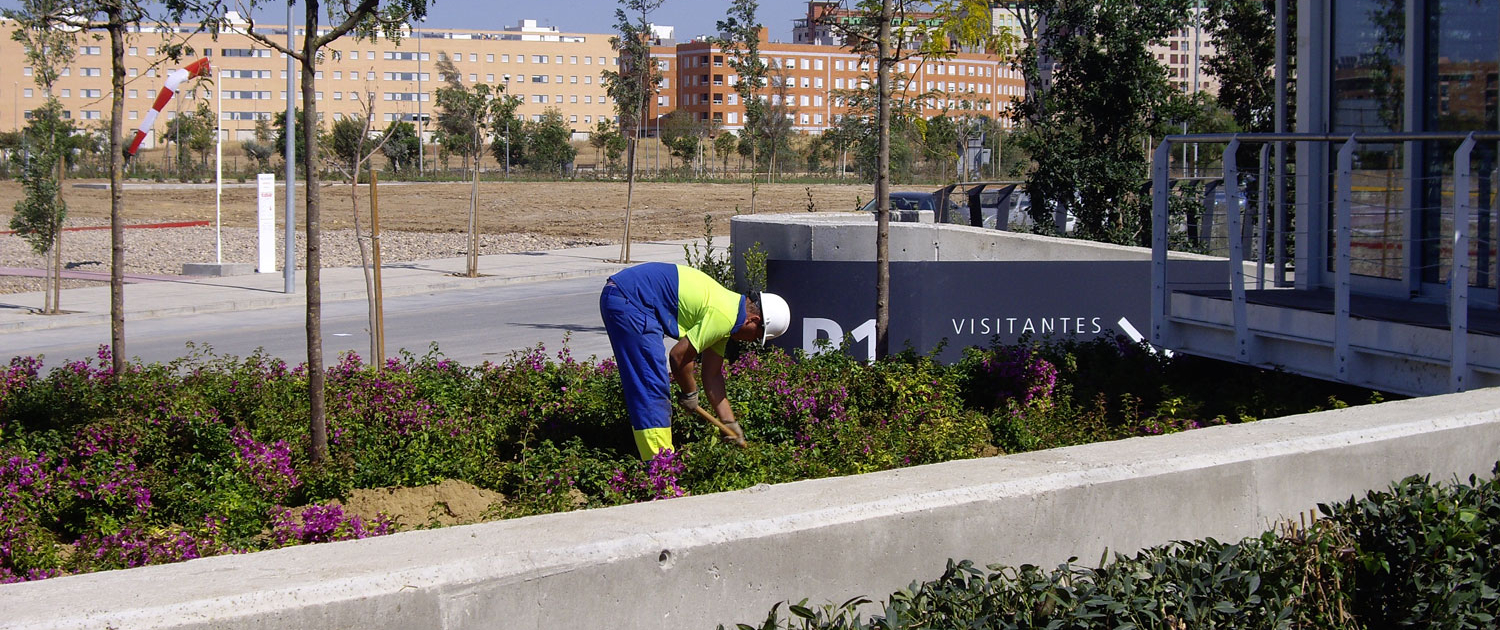 Obra singular por el reto que supuso su ejecución sobre un forjado, debido a las características constructivas de los edificios, y la dificultad que supuso trabajar en reducidos espacios interbloques para el aporte de sustratos especiales y plantación y anclaje de árboles de gran porte. Para ello fue necesario el empleo de grandes grúas en los puntos de plantación, especialmente con los ejemplares de Phoenix dactyliphera de 9 metros de longitud.